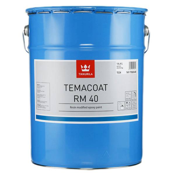 Универсальная двухкомпонентная, модифицированная смолой, эпоксидная краска, которая может использоваться для внутренних и наружных, подземных и подводных конструкций. Темакоут РМ 40 может использоваться в качестве грунтовки или покрывной краски для стальных, алюминиевых, оцинкованных поверхностей, подвергающихся значительным механическим и/или химическим воздействиям как внутри, так и вне помещений. Рекомендуется для окраски каркасов зданий, конвейеров, трубных эстакад, корпусов судов и других стальных конструкций и оборудования. Подходит также для окраски подземных и подводных конструкций. Темакоут РМ 40 образует покрытие с высокой степенью износо-, водо- и химической стойкости. Применяется для бетонных поверхностей.