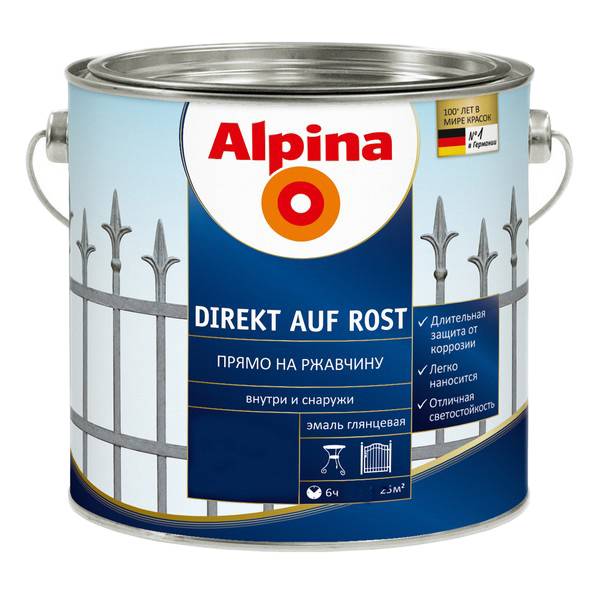 Alpina Direkt auf Rost — это специальная эмаль, объединяющая в себе три свойства: отличная антикоррозийная грунтовка, долговременная защита от ржавчины и финишное покрытие. Вне зависимости от инструмента нанесения — валиком, кистью или краскопультом — эта эмаль поражает своими отличными возможностями применения.