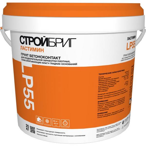 Грунт Бетон-Контакт Стройбриг Ластимин LP-55 - предназначен для предварительной обработки и обеспыливания минеральных оснований. Применяется для подготовки поверхности под последующее нанесение отделочных материалов: штукатурок, плиточных клеёв.
