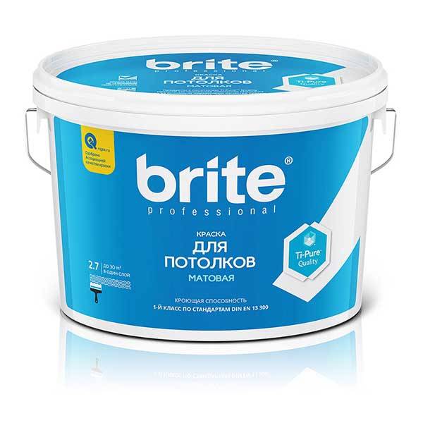 Профессиональная акриловая краска Brite Professional Ti-Pure™ Quality для потолков предназначена для ответственных работ по отделке потолков (по гипсокартонным, кирпичным, бетонным, оштукатуренным, зашпатлеванным поверхностям) в сухих помещениях зданий категорий А,Б,В с нормальной эксплуатационной нагрузкой. Допускается отделка стен, не требующих влажной уборки. Образует супербелое бархатистое покрытие, устойчивое к сухой уборке. Удобна при нанесении, не брызгает с малярного инструмента, легко и ровно наносится, имеет хороший розлив.