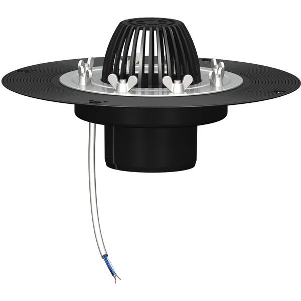 Кровельная воронка ТП-01.100-Э с листвоуловителем, электрообогревом, с прижимным фланцем из нержавеющей стали, с вертикальным выходом D 110, высотой 102мм, с технологическими отверстиями для дополнительной фиксации к основанию кровли – ж/б перекрытиям, профнастилу из стального листа. Предназначены для сбора и отведения сточных дождевых и талых вод с поверхности кровель. Для предотвращения замерзания воды в приемном отверстии, в отверстии, в переходное время года (осень-зима-весна), все кровельные воронки Татполимер, могут быть оснащены системой обогрева. Система обогрева включает в себя обод фиксации, в который укладывается саморегулирующийся кабель и крепит его к корпусу воронки. Используемый саморегулирующийся кабель с рабочим напряжением 220В, мощностью 15Вт меняет свою теплоотдачу в зависимости от температуры окружающей среды. Для ограничения подогрева и экономии электроэнергии, рекомендуется подключение саморегулирующегося кабеля через термостат, работающий в диапазоне температур -5С до +5С. В противном случае, обогрев будет осуществляться при более низких минусовых температурах, что не является обязательным, так как во время морозов снег на кровле не тает, и нет необходимости в отводе воды.