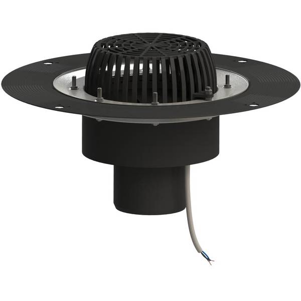 Кровельная воронка с вертикальным выпуском диаметром DN 110 и длинной 170-450мм, с декоративной надставкой решеткой из полипропилена для предотвращения попадания в дождевую канализацию веток и листвы, с прижимным фланцем из нержавеющей стали, с электрообогревом от сети 220В мощностью 15Вт. Саморегулирующийся кабель для электрообогрева уложен в обод фиксации, который жестко крепится к корпусу воронки. Свободный конец электрокабеля выводиться наружу и вниз.
