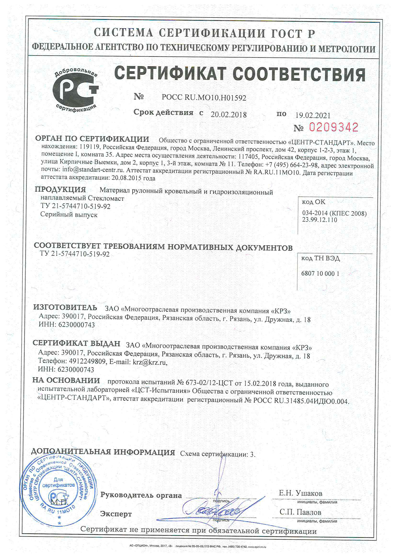 Стекломаст ТКП – кровельный битумный материал с усиливающей прослойкой из стеклоткани. Каркас пропитан битумным вяжущим с пластификаторами и наполнителями. Поверхность гидроизоляции с наружной стороны защищена сланцевой крошкой, с внутренней - полиэтиленовой пленкой. Рекомендуется для укладки верхнего слоя при ремонте и строительстве фундаментов, крыш, тоннелей, других конструкций.