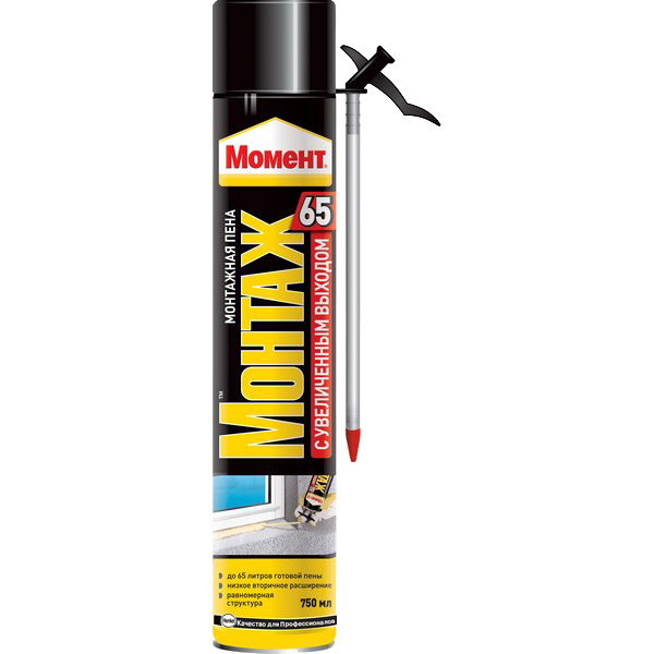 Монтажная пена Момент Монтаж Стандартная с увеличенным выходом представляет собой готовую к применению однокомпонентную полиуретановую пену, затвердевающую под воздействием влажности воздуха. Увеличенный выход достигается за счет использования специальной трубочки с аппликатором