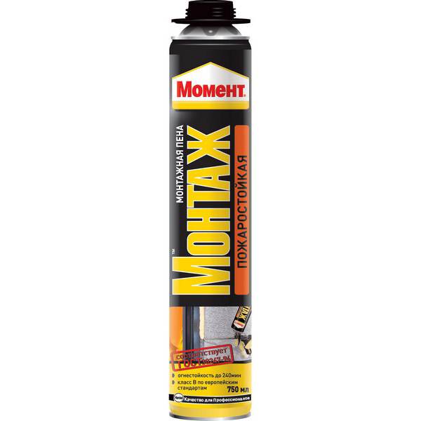 Монтажная пена Момент Пожаростойкая - специальная пена для заполнения швов строений и конструкций, где необходима высокая огнестойкость, применяемой в виде уплотняющей пены, при нанесении между минеральными материалами; соответствующий классу огнестойкости В по EN13823 и EN 11925-2, [классификация по EN13501-1]