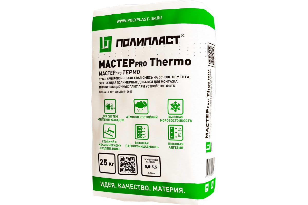 МАСТЕРpro Thermo - универсальный клеевой и базовый штукатурный состав на основе цементного вяжущего с полимерными добавками. Для устройства фасадных теплоизоляционных композиционных систем с наружными штукатурными слоями. Применяется для приклеивания плит из пенополистирола и минеральной ваты, устройства на их поверхности защитного базового штукатурного слоя, армированного фасадной щелочестойкой стеклосеткой. Пригоден как для ручного, так и для механизированного нанесения.
