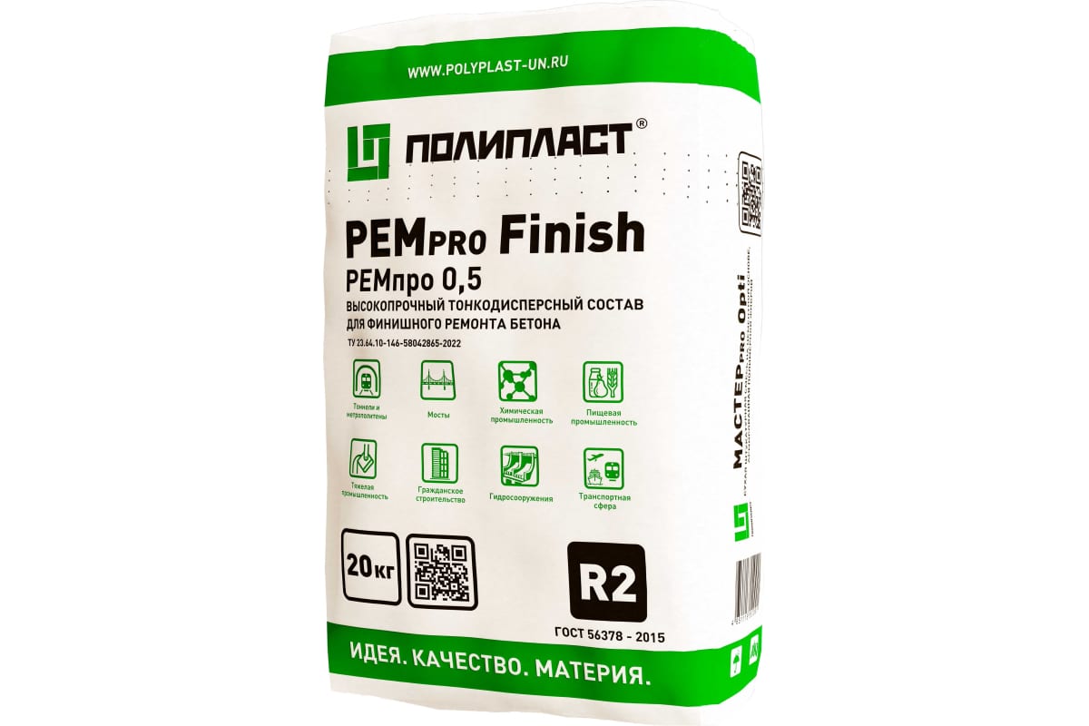 Сухая ремонтная, тонкодисперсная, безусадочная смесь тиксотропного типа для финишной отделки бетонных и железобетонных конструкций с толщиной применения от 0,5 до 7 мм Состав не содержит хлоридов, сульфатостойкий. Температура применения РЕМpro Финиш: от +5°С до +35 °С