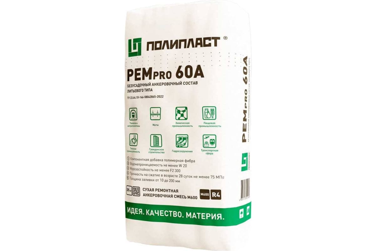 РЕМпро 60А – это сухая смесь с максимальной крупностью заполнителя 2,5 мм, на основе высокопрочного цемента, фракционированного песка, с полимерной фиброй и специальными добавками. Изготавливается по ТУ 23.64.10-147-58042865-2022. После смешивания с водой образует реопластичный, литой гомогенный состав, который возможно применять методом укладки в опалубку на толщину от 10 до 200 мм (и более при добавлении крупного заполнителя) *. Не содержит хлоридов и металлических заполнителей. Температура применения от +5°С до +35 °С.