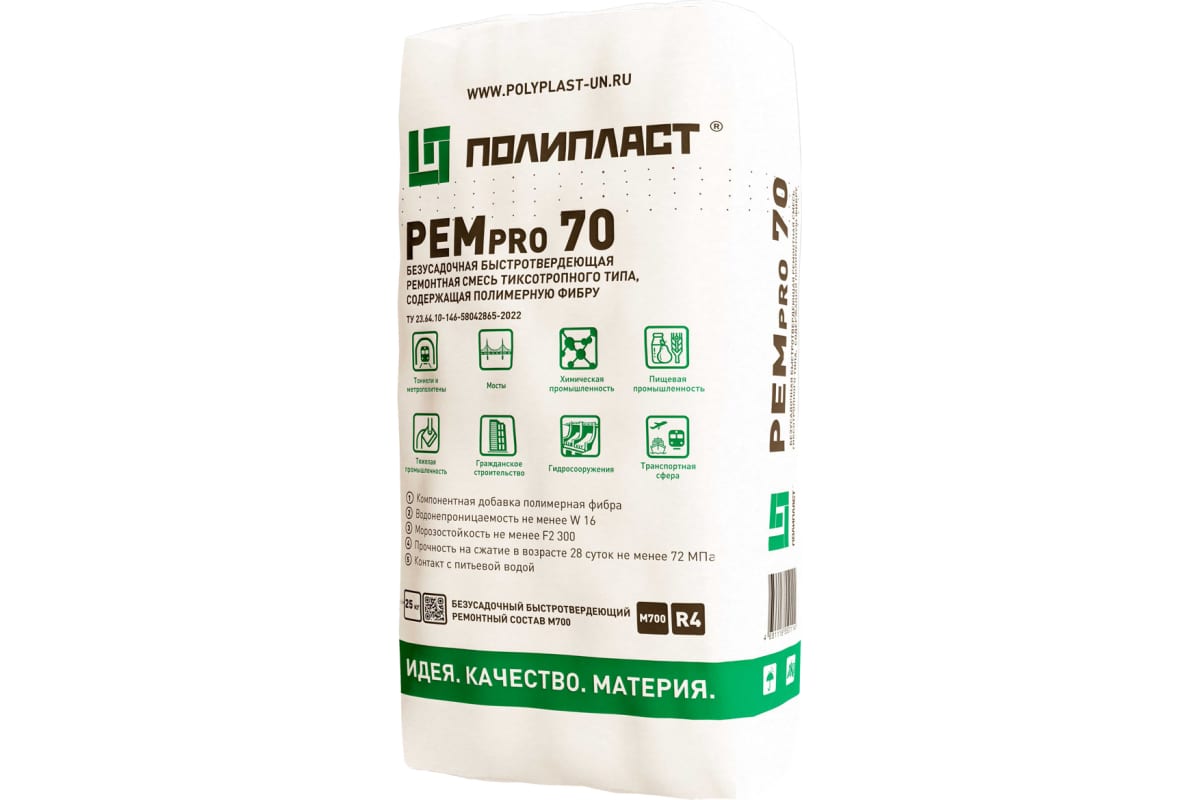 ремонтный материал, созданный на основе высокопрочного цемента, фракционированного песка и специальной добавки, содержащий полимерную фибру. После смешивания с водой образует реопластичный, тиксотропный гомогенный состав, легко наносимый на поверхность конструкций без применения опалубки. РЕМрго 70 является безусадочным, как в твердом, так и в пластичном состоянии. Не имеет металлических заполнителей и не содержит хлоридов. В затвердевшем состоянии представляет собой высокопрочный материал, обладающий высокой морозостойкостью и водонепроницаемостью, устойчивый к истиранию, и обладающий высокой адгезией к основанию. Толщина нанесения в один слой от 10 до 50 мм. Температура применения от +5°С и до +35°С.