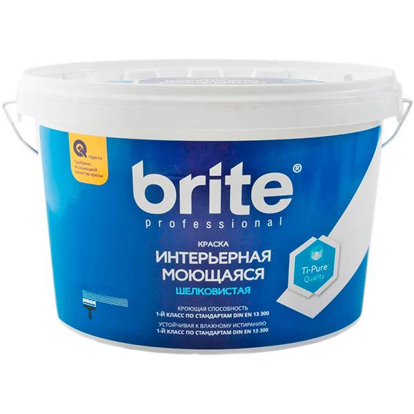 Профессиональная акриловая краска Brite Professional Ti-Pure™ Quality интерьерная моющаяся предназначена для ответственных работ по отделке стен и потолков (по гипсокартонным, кирпичным, бетонным, оштукатуренным, зашпатлеванным поверхностям) в жилых и общественных помещениях зданий категорий А, Б, В с высокой эксплуатационной нагрузкой, требующих частой влажной уборки. Образует благородное покрытие с легким шелковистым блеском. Особенно удобна при нанесении на вертикальные поверхности, не брызгает с малярного инструмента, легко и ровно наносится, имеет хороший розлив.