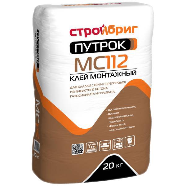 Клей монтажный Стройбриг Путрок MG115 предназначен для кладки стен и перегородок из блоков и плит на основе ячеистого бетона (пено- и газобетон), газосиликата и силиката. Используется для тонкослойной кладки пазовых и беспазовых блоков. Для внутренних и наружных работ.