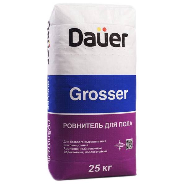 Ровнитель для пола Dauer Grosser (Дауэр Гроссер) предназначен для предварительного выравнивания оснований и устройства высокопрочных стяжек слоем от 10 до 200 мм под наливной пол или под последующее декоративное покрытие. Для ручного нанесения. Прочность на сжатие - не менее 30 МПа. Армирован фиброволокном. Для полов с подогревом в системе "теплый пол", водостойкий, морозостойкий.