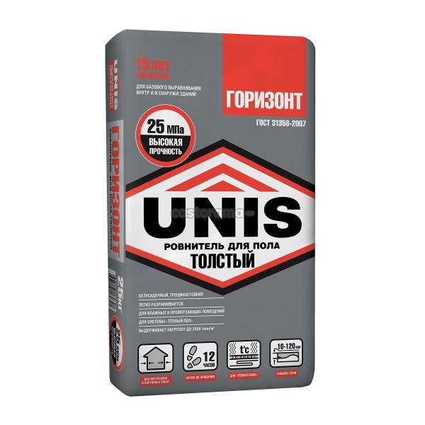 Ровнитель для пола ЮНИС Горизонт Толстый используется для подготовки прочных, ровных оснований (стяжек) для последующей укладки декоративных напольных покрытий, нанесения тонкослойных наливных ровнителей.