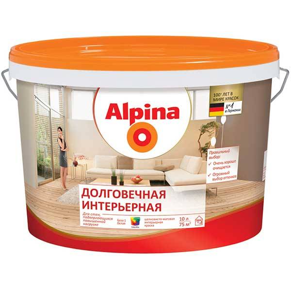 Alpina Долговечная интерьерная — шелковисто-матовая дисперсионная краска, которая благодаря огромному многообразию оттенков позволит каждому найти тон на свой вкус. Обладая превосходной способностью к очистке, эта краска позволяет создать в жилых и рабочих помещениях с высокими поверхностными нагрузками оптимальным образом защищённые и долговечные поверхности.