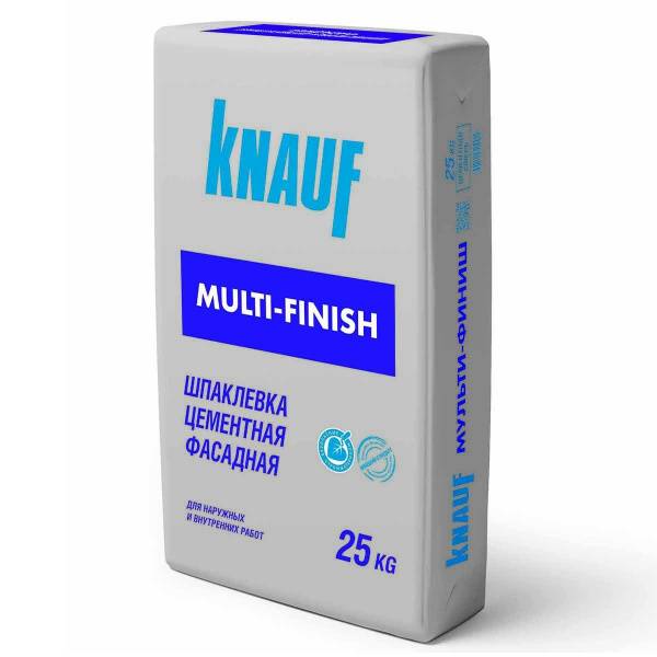 Шпаклевка гипсовая финишная КНАУФ-Мульти-Финиш. Сухая шпаклевочная смесь на основе высокопрочного гипса и полимерных добавок. Применяется для профессионального ремонта внутри помещений. Быстро высыхает на обработанной поверхности, не дает усадки и трещин. После высыхания образует гладкую светлую поверхность готовую под финишное покрытие краской или обоями.