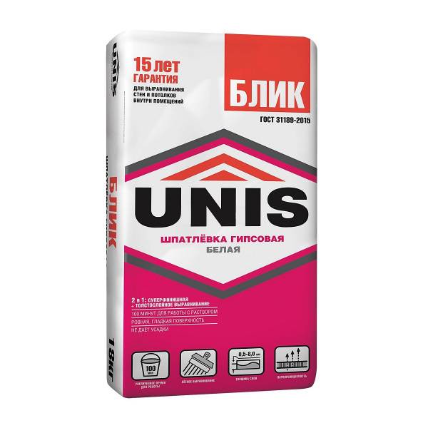 Шпатлевка «Юнис Блик» изготовлена на основе природных материалов для толстослойного финишного выравнивания поверхностей стен и потолков под последующую декоративную отделку; заделки неглубоких выбоин, трещин, раковин слоем до 8 мм, швов ГКЛ, ГВЛ с использованием армирующей ленты. Применяется внутри отапливаемых помещений с нормальной влажностью. «Юнис Блик» используется по бетонным основаниям, гипсовым и цементным штукатуркам, ГКЛ, ГВЛ, ПГП, любым другим гипсовым и цементным поверхностям, не требующим базового, толстослойного выравнивания.