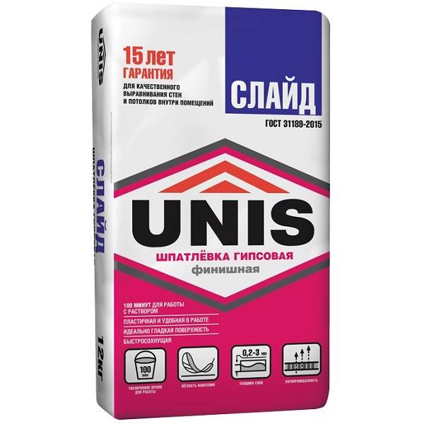 Шпатлевка «Юнис Слайд» изготовлена на основе природных материалов для финишного тонкослойного идеально гладкого выравнивания поверхностей стен и потолков внутри помещений с нормальной влажностью для последующей декоративной отделки. Особенно рекомендуется под окрашивание. «Юнис Слайд» используется внутри отапливаемых помещений с нормальной влажностью. по бетонным основаниям, гипсовым и цементным штукатуркам, ГКЛ, ГВЛ, ПГП, любым другим гипсовым и цементным поверхностям, не требующим базового толстослойного выравнивания.