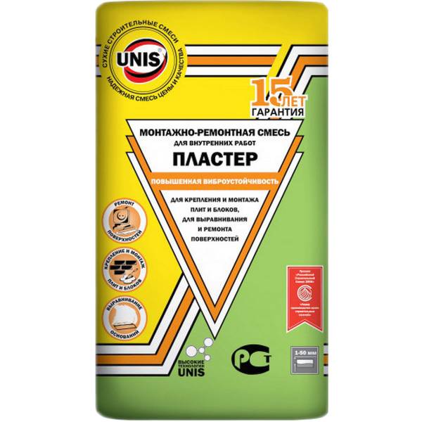 Гипсовая клей-шпатлевка «Юнис Пластер» производителя «Юнис» применяется по гипсовым, бетонным, пенобетонным, цементно-песчаным, газосиликатным и другим недеформирующимся основаниям. «Пластер» является универсальным материалом с широкой областью применения: ремонт различных поверхностей, приклеивание листов ГКЛ и ГВЛ, базовое и финишное выравнивание оснований. Гипсовая монтажно-ремонтная смесь «Пластер» обладает паропроницаемостью. Усиленная фиброволокнами смесь «Пластер» обладает виброустойчивостью, трещиностойкостью, безусадочностью, что гарантирует получение надежного результата при проведении работ, а также долговременное сохранение качества получаемой поверхности. Отличается также высокой клеящей способностью.