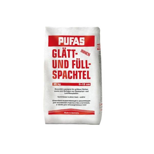 Pufas Glatt- und Fullspachtel гипсовая шпатлевка усиленная целлюлозой, которая создаёт гладкую, ровную и высококачественную основу для последующих малярных и обойно-оклеечных работ. Используется внутри помещений. После размешивания с водой образует устойчивую шпаклёвочную массу.
