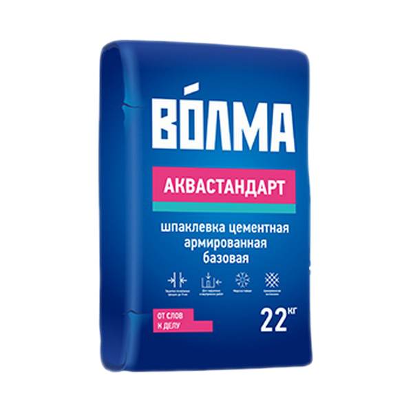 «Волма-Аквастандарт» - сухая цементная шпаклевочная смесь на основе портландцемента с минеральными и полимерными добавками, безусадочная, влагостойкая, армированная волокнами.