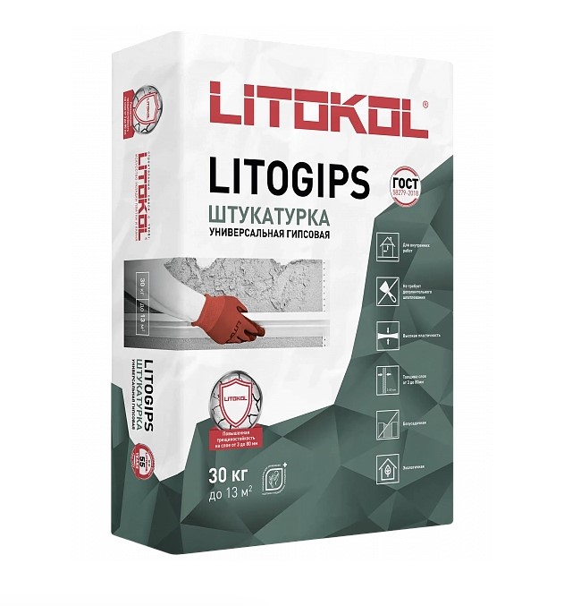 LITOKOL LITOGIPS серая (30 кг) — гипсовая универсальная штукатурка для выравнивания вертикальных оснований от 3 до 80 мм за одно нанесение.