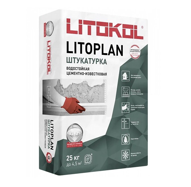 LITOKOL Litoplan (25 кг) — цементно-известковый штукатурный состав стандартного схватывания и высыхания, на основе гидравлических вяжущих, инертных наполнителей и специальных органических добавок.