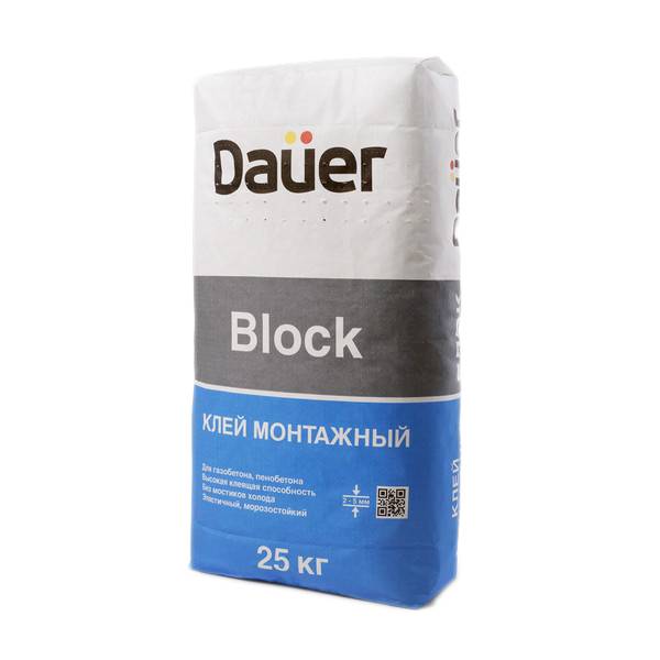 Клей монтажный Dauer Block ("Дауэр Блок") предназначен для кладки блоков из газобетона, пенобетона, газосиликата, пенополистиролбетона, известково-песчаных блоков. Толщина слоя от 2 до 5 мм. Высокая клеящая способность, ровная и чистая кладка блоков без образования мостиков холода. Водостойкий, морозостойкий.