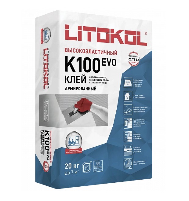 HYPERFLEX K100 EVO (класс C2TES2 по ГОСТ Р 56387, 20 кг) — клей фиброармированный высокоэластичный тиксотропный для керамической плитки, керамогранита и камня, в том числе крупного формата размером более 300×300 см.
