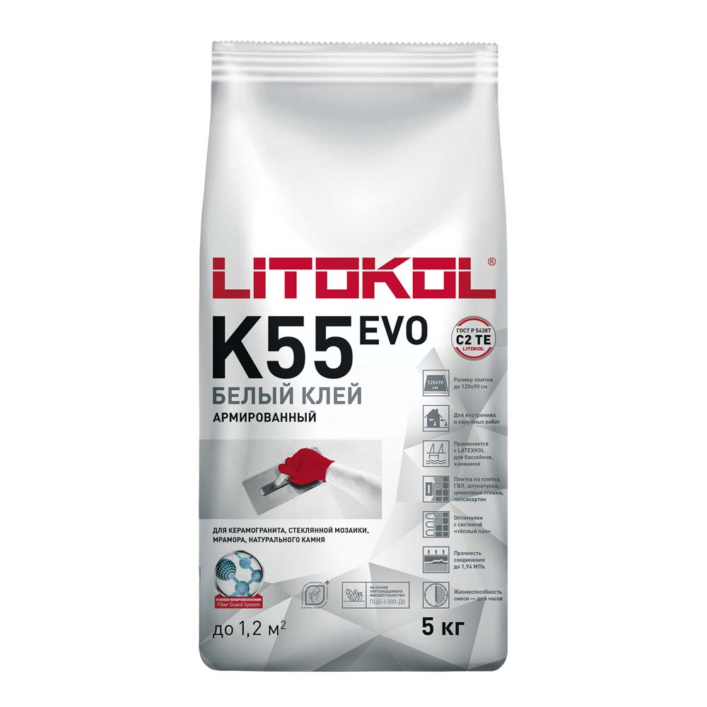 «Litoplus K55» — сухая клеевая смесь на основе белого цемента. После затворения водой образует пастообразный, эластичный клеевой раствор с высокими адгезивными свойствами. Клеевой раствор имеет высокую водоудерживающую способность, технологичен, удобен в работе. Обладает повышенной тиксотропностью, поэтому при облицовке вертикальных поверхностей с помощью клея «Litoplus K55» сползание плитки или мозаики отсутствует. Так как клей белого цвета, он в особенности рекомендуется при укладке цветной и прозрачной стеклянной мозаики и плитки из натурального белого камня без изменения их цвета. Клей «Litoplus K55» водо- и морозостойкий. Экологически безопасен, не содержит волокон асбеста.