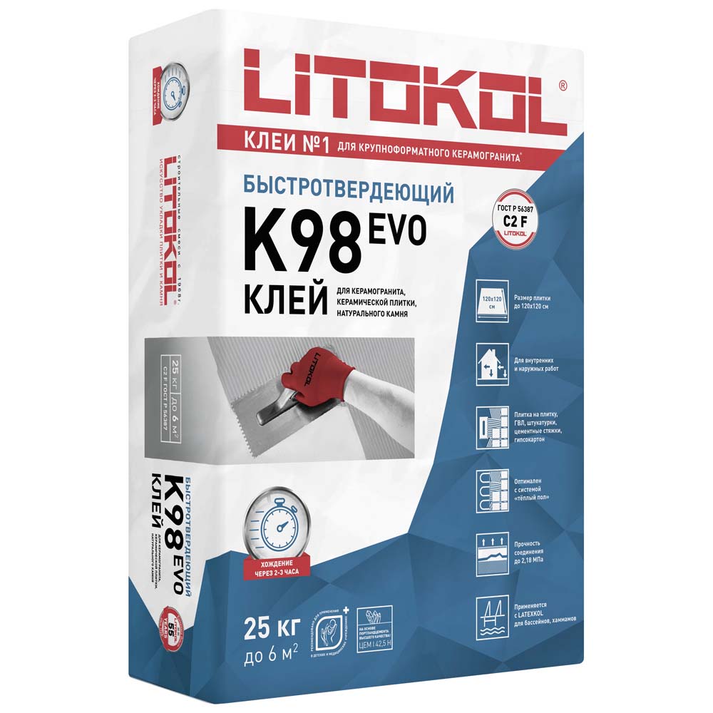 «Litostone K98» — клеевая смесь, предназначенная для укладки любого типа плитки из керамогранита, керамики и натурального и искусственного камня, за исключением материалов, подверженных высокой линейной деформации, таких как зелёный мрамор, песчаник и т.д. Применяется для укладки гранита, базальта, темных видов мрамора, натурального камня с плотной структурой. Применяются при внутренней и наружной облицовке стен и полов. Рекомендуемые основания: