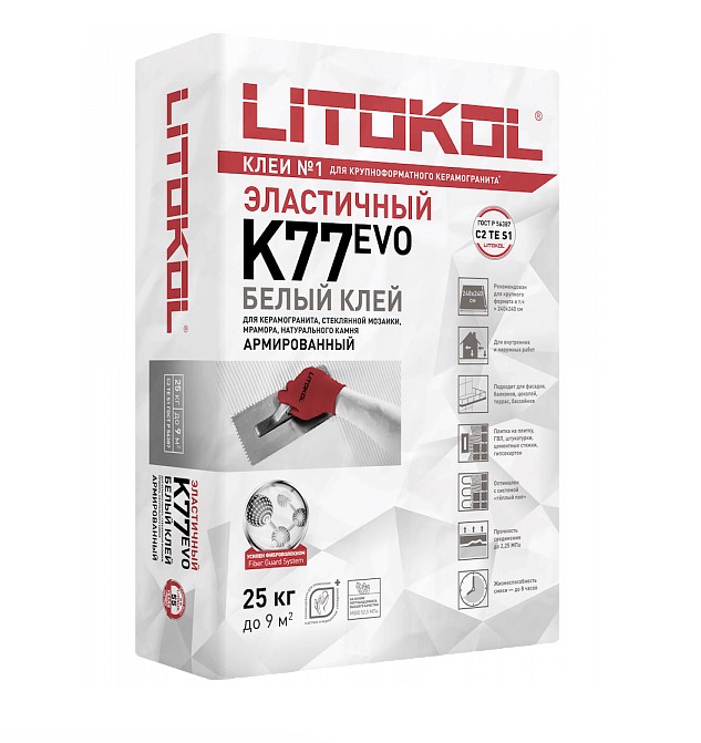 LITOKOL SuperFlex K77 (класс C2TES1, 25 кг, белый) — клей белый фиброармированный эластичный тиксотропный для укладки мрамора, натурального камня светлых пород, керамической плитки и керамогранита, в том числе крупного формата размером до 240×240 см.