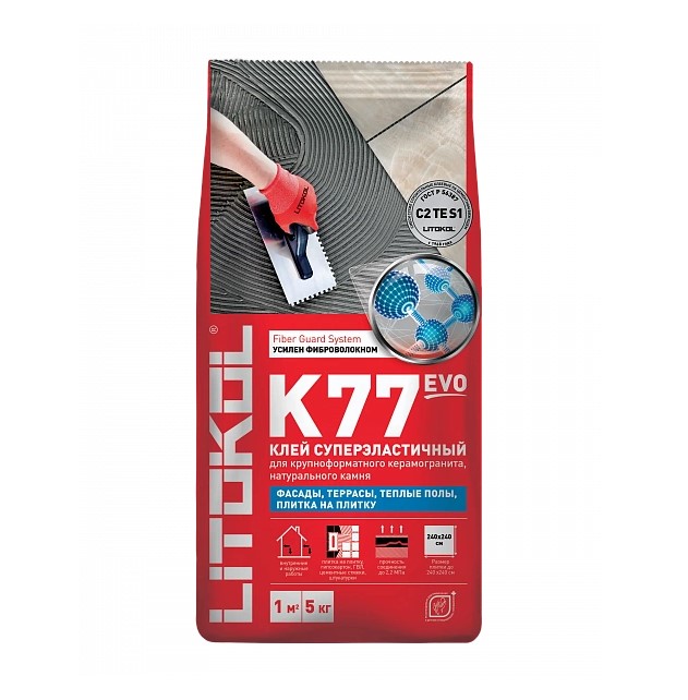 LITOKOL SuperFlex K77 (класс C2TES1, 5 кг) — клей фиброармированный эластичный тиксотропный для укладки натурального камня, керамической плитки и керамогранита, в том числе крупного формата размером до 240×240 см.