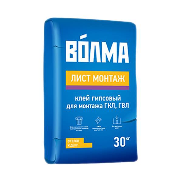 «Волма - Лист Монтаж» – сухая монтажная смесь на основе гипсового вяжущего, модифицированная минеральными и химическими добавками, обеспечивающими высокую адгезию, водоудерживающую способность, оптимальное время работы.