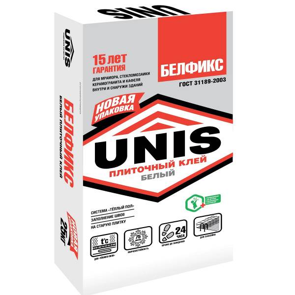 Белый плиточный клей "Белфикс" используется для укладки декоративной керамической, кафельной, керамогранитной, мозаичной и стеклянной плитки, стеклоблоков, плит из природного камня на пол и стены, в резервуарах с водой и помещениях с повышенной влажностью, при проведении внутренних и наружных работ.